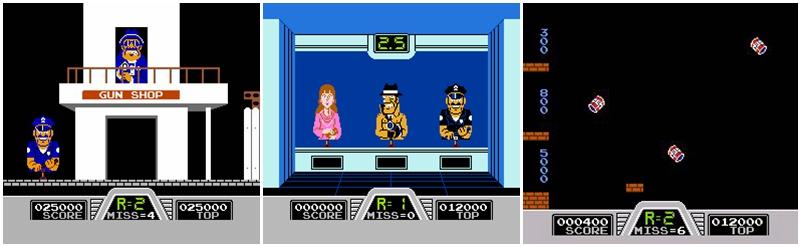 比如上文提到的《荒野枪手》,任天堂就把它移植到了FC上。游戏分成两种游玩模式,“帮派”中玩家需要在随机打开的窗口中射击敌人,而“匪徒”则是类似牛仔决斗,在屏幕提示“开火”的瞬间扣下扳机。当游戏结束时,会播放肖邦的《送葬进行曲》。